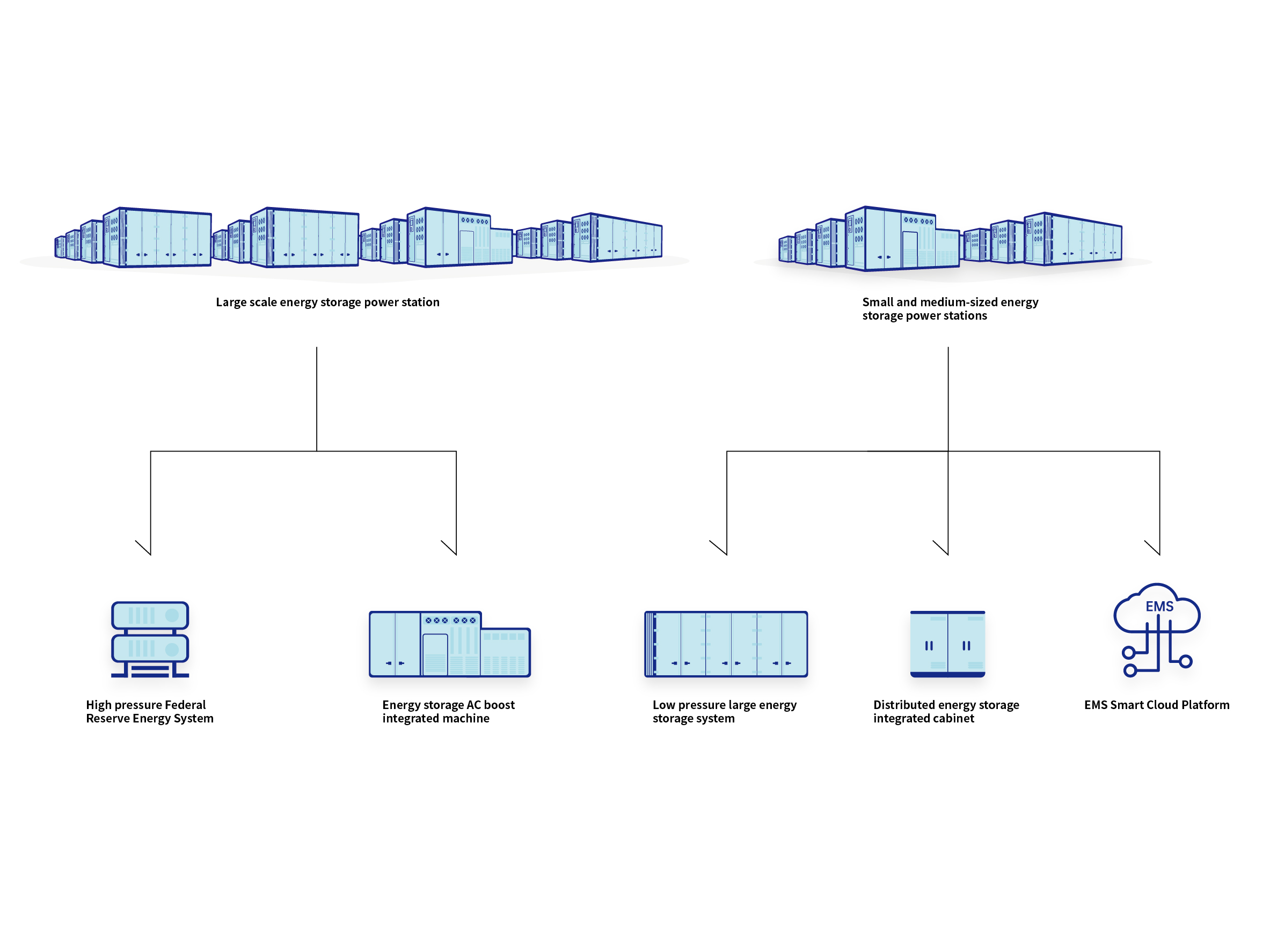 Cover all the application scenarios from distributed small-scale, centarlized medium-scale industrial energy storage station, to grid-side large-scale independent energy storage station.
