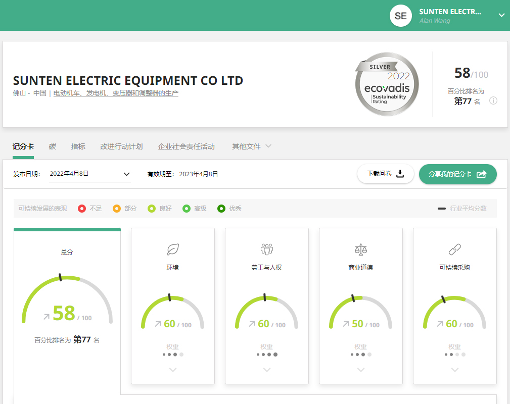 在各部门的共同努力下,3月22日,项目工作组把全部资料按要求提交,正式上传EcoVadis平台。4月8日,工作组查询EcoVadis平台的评审结果,公司获得58分(银牌)的好成绩!