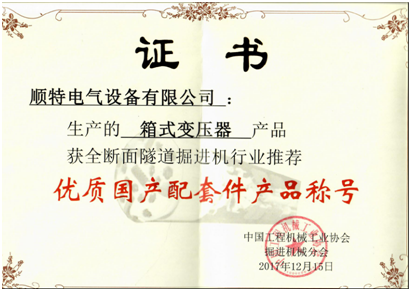 近期,公司在中国工程机械工业协会掘进机械协会组织评选的优质产品称号名单中榜上有名——我公司生产的盾构机专用箱式变压器产品荣获全断面隧道掘进机行业推荐“优质国产配套件产品” 称号。